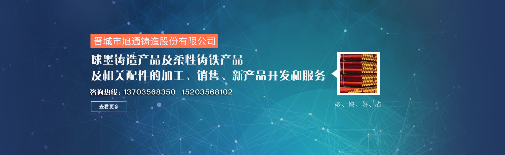 晉城市旭通鑄造股份有限公司是一家致力于球墨鑄造產(chǎn)品及柔性鑄鐵產(chǎn)品及相關(guān)配件的加工、銷售、新產(chǎn)品開(kāi)發(fā)和服務(wù)的網(wǎng)絡(luò)平臺(tái),以“多、快、好、省”為服務(wù)宗旨,多種選擇、快速定位、優(yōu)質(zhì)產(chǎn)品、省錢(qián)省力,為客戶提供精準(zhǔn)服務(wù)......